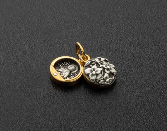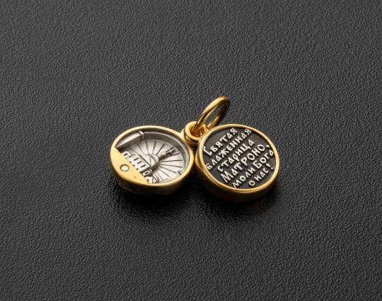 серебра 925 пробы. Внутри размещен образ Святой Преподобной Матроны Московской. Считается, что родители Матронушки хотели отдать её в приют из-за слепоты. Но во сне к матери явилась слепая белая птица. Этот сон повлиял на решение и Святая осталась в своей семье. На внешней стороне подвески изображен образ этой птицы с женским лицом. Уже в семилетнем возрасте ей открылся дар предсказания и исцеления больных.