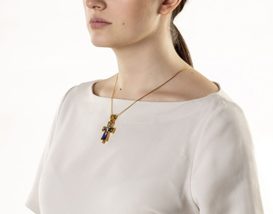 Крест- мощевик, покрытый позолотой и украшенный эмалевой росписью, при помощи которой нанесены изображения Святых. На одной стороне - Распятие Иисуса Христа. На обороте - икона Николы Зарайского. К нему обращаются в любых жизненных ситуациях, начиная от житейских проблем  и просьб о помощи и покровительстве в путешествиях, заканчивая молитвами о духовном и физическом исцелении себя и своих близких.
