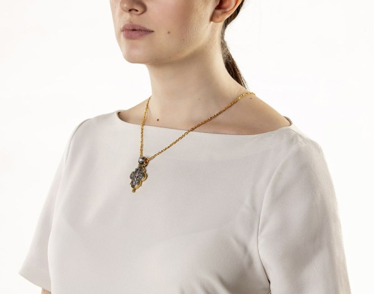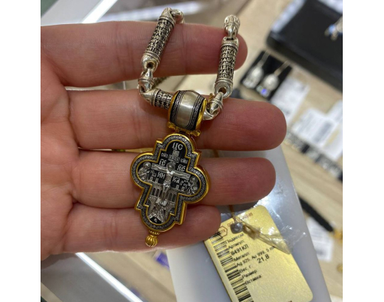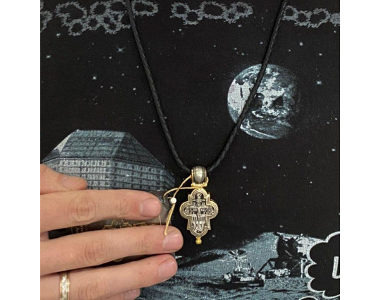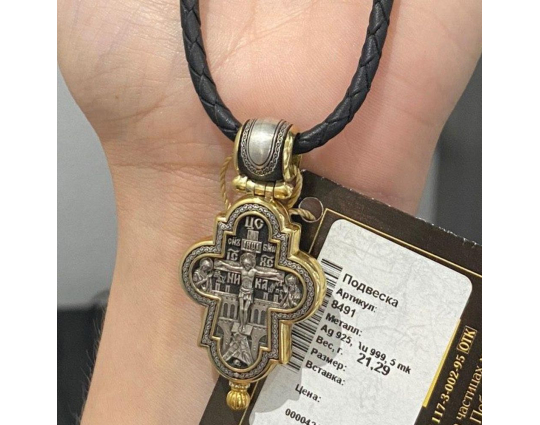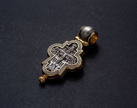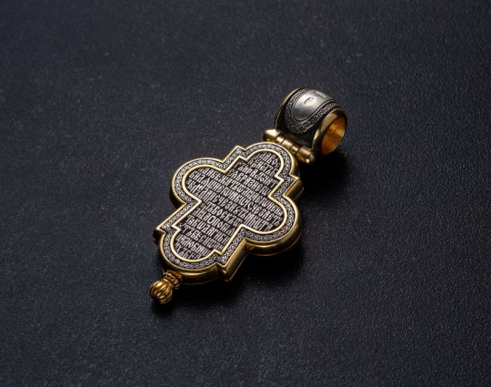 Мощевик из серебра с позолоченной отделкой. На лицевой стороне - Деисус. Это композиция, состоящая из изображения Распятия Иисуса в центральной части и предстоящих ему в молитве Богородицы и Иоанна Предтечей. На обороте мощевика - оградительная молитва. Ее читают в случае опасности.