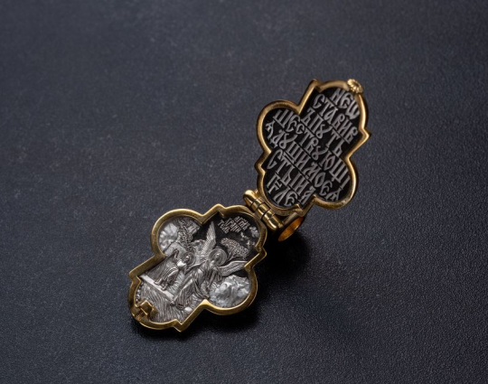 На внутренних створках мощевика расположено изображение Ангела Хранителя, который ведет ребенка. Ребенок - это и есть душа человеческая. Такое изображение символично. Оно показывает то, как Ангел охраняет человека, помогает ему преодолеть все препятствия. Но, не стоит забывать о том, что по своему желанию Ангел не может вмешиваться в судьбу человека, его нужно просить о помощи. Поэтому, рядом с этим изображение написана молитва Ангелу-Хранителю.