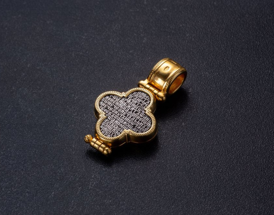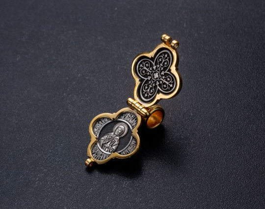 Крест-мощевик с изображением Распятия Иисуса на лицевой стороне. Вокруг него изображения тех Святых, которые были рядом с ним в момент казни. На обороте - молитва Честному Кресту. К ней прибегают в случае опасности.