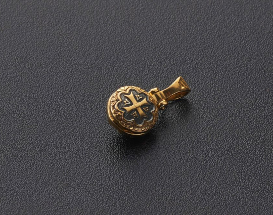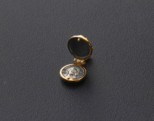 Внутри изображена Казанская икона Богородицы. Она известна своими чудесными исцелениями. Молитвы к ней способны избавить от бед, людей со злыми намерениями. Она покровительствует невестам, помогает обрести семейное счастье и оберегает детей от заболеваний и невзгод.