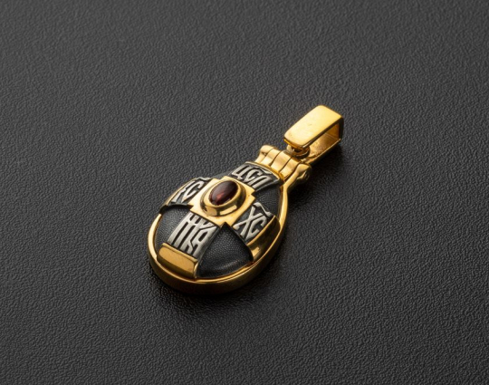 Складень выполнен в форме яйца. Это символ жизи. На лицевой стороне изображен крест с традиционными обозначениями. Это надписи «Иисус Христос – Царь Славы», и слово «НИКА» - "Победа".