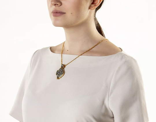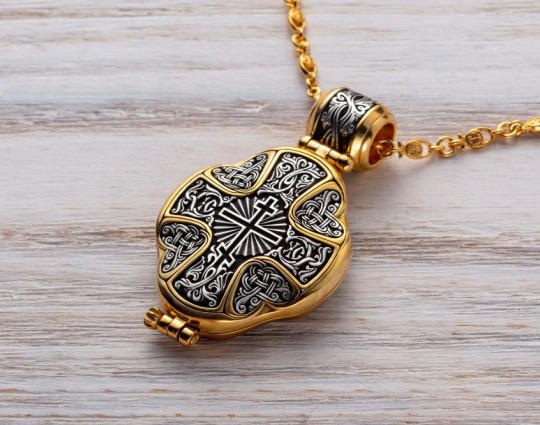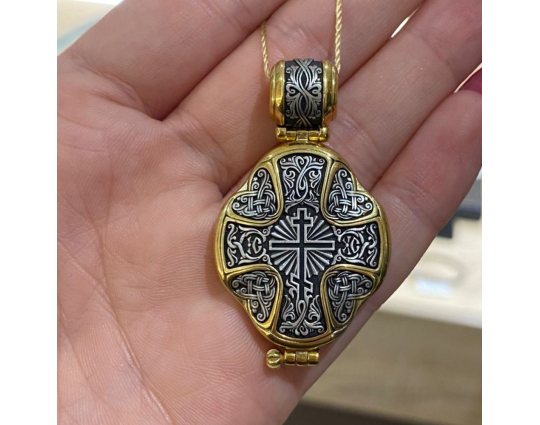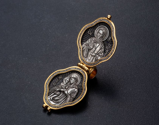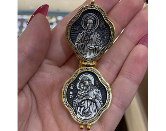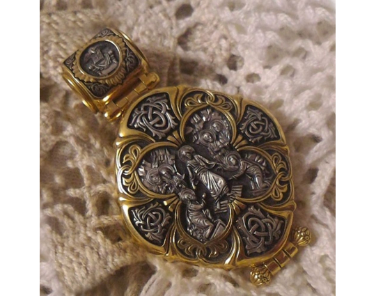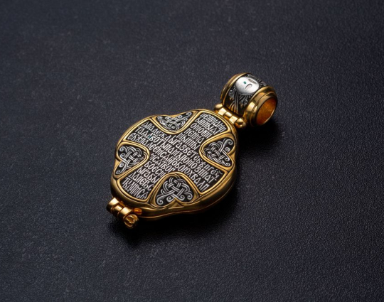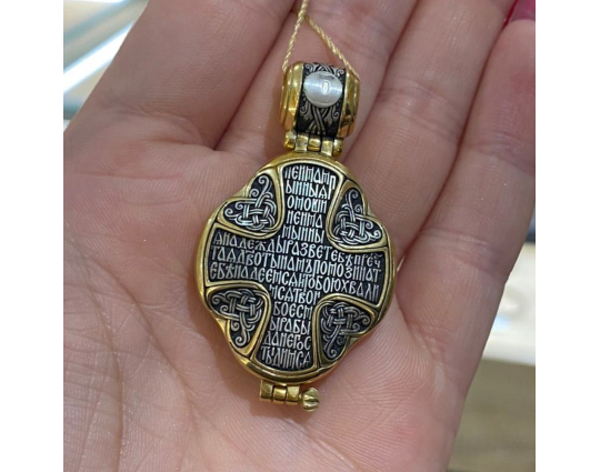 Серебряный мощевик с изящной позолоченной отделкой. На лицевой стороне- Голгофский крест. Символ веры, символ ее принятия, боли и одновременно бесконечной любви ко всему живому. На нем был распят Иисус Христос. На обратной стороне ювелирного изделия начертаны слова-обращения к Пресвятой Богородице.