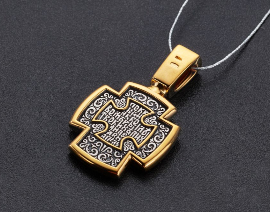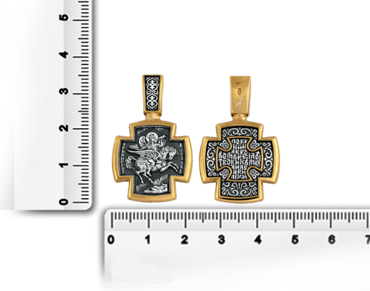 Серебряный образок с позолоченным контуром выполненный в виде креста. На нем - Архангел Михаил, который скачет на необычном коне с крыльями и трубит в рог. Так он созывает своих помощников на борьбу со злом.