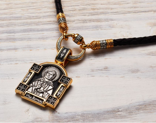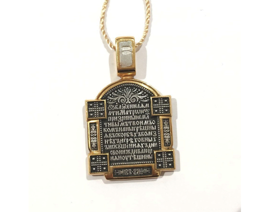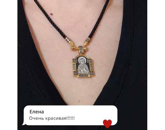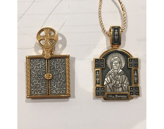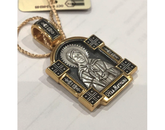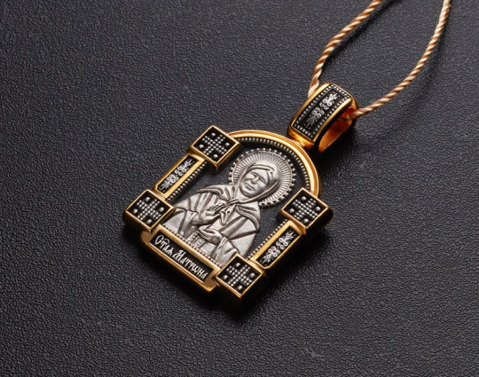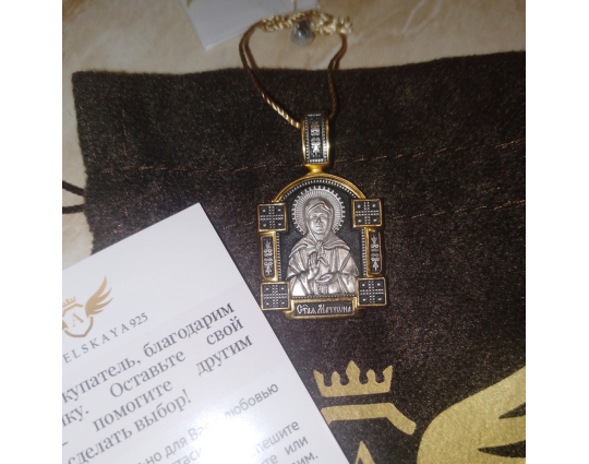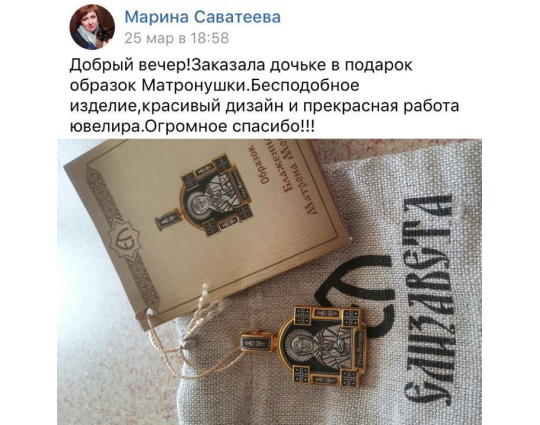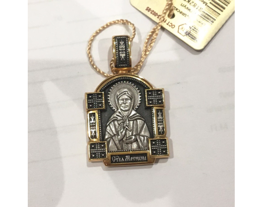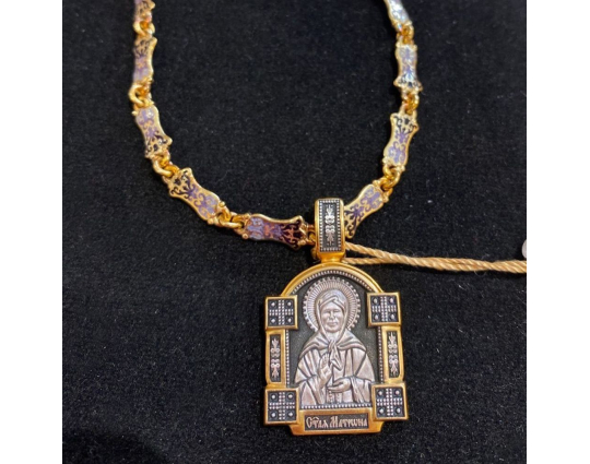 Серебряный образок с позолоченными элементами и с изображением Блаженной Матроны. Верующие ее чтят за особый дар духовного зрения, за исцеление болезней, за помощь страждущим. По бокам от иконы расположено 2 массивные планки с узором и 4 квадрата-украшения. Это дополняет икону и делает образ Святой более статным.