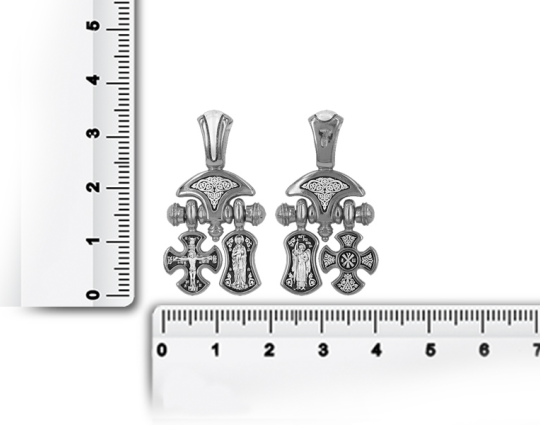 Серебряная подвеска с родиевым покрытием состоит из двух частей, которые крепятся на декоративном элементе и горизонтальной планке. Родиевое покрытие защищает изделие от воздействий окружающей среды и сохраняет его первоначальный вид.