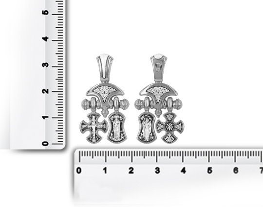 Серебряная подвеска состоит из двух частей, которые крепятся на декоративном элементе и горизонтальной планке.