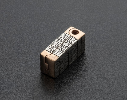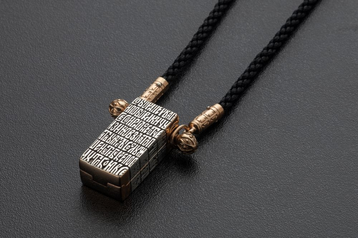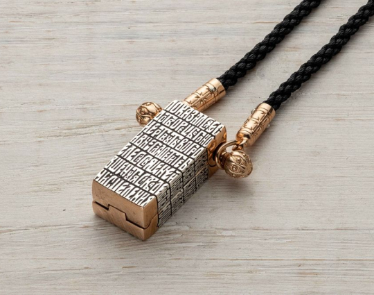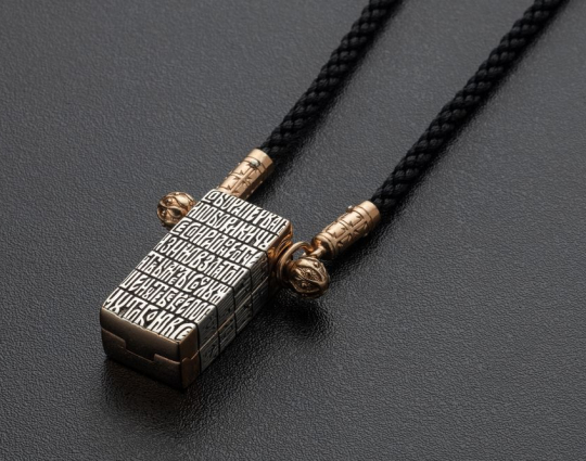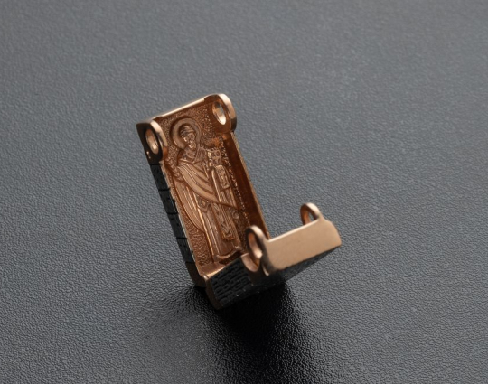 Подвеска с молитвой выполнена в форме кирпича. Это отсылка к одному из чудес святого, когда он доказал свое единение со Святой Троицей, выжав из кирпича воду, пустив огонь, а саму глину сжав руками.