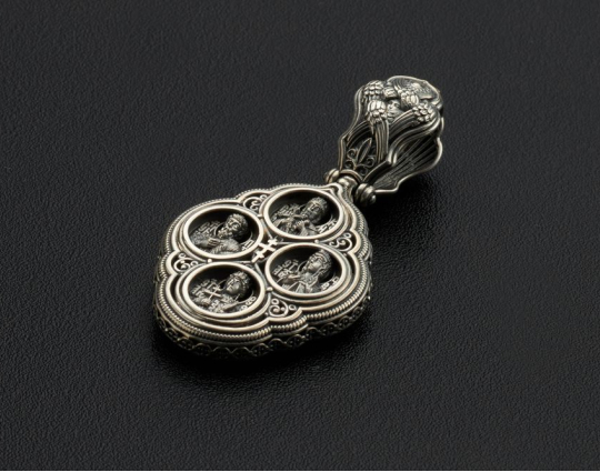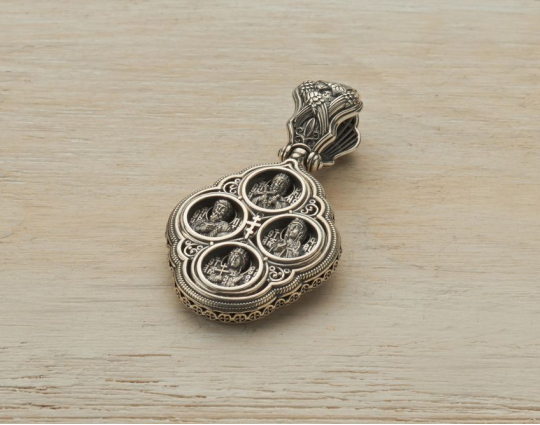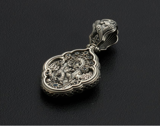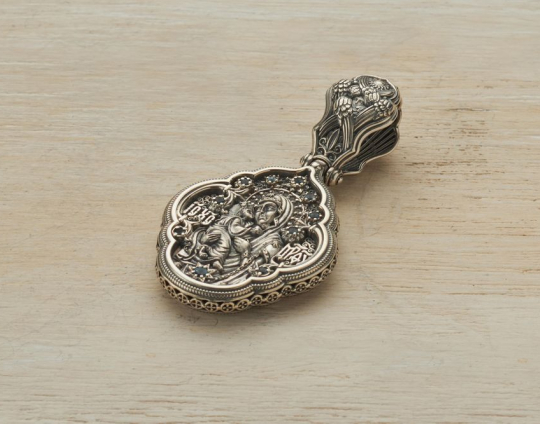 Православный образок из серебра обрамлен кружевом из цветов и сияющими камнями. Образок может быть парным к Богородичному кресту.