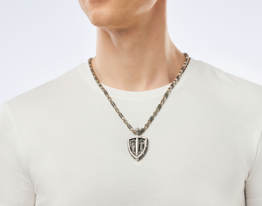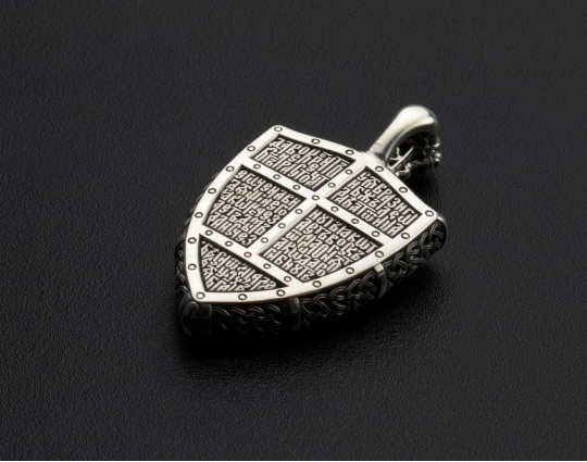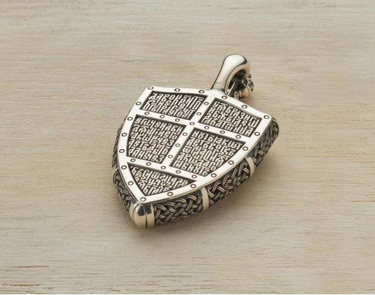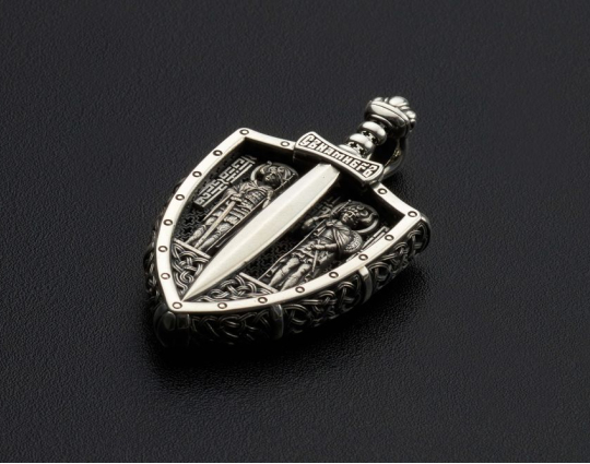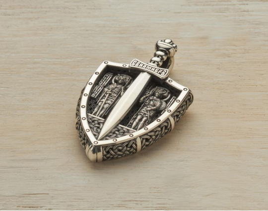 Православный образок из серебра выполнен в виде щита и меча. На гарде меча находятся слова «С нами Бог!». С двух сторон от меча — иконы воинов, чьи имена стали символами побед нашего народа. Слева стоит, опираясь на меч, великий князь святой благоверный Александр Невский, справа — почитаемый во всем христианском мире воин-мученик Георгий Победоносец.
