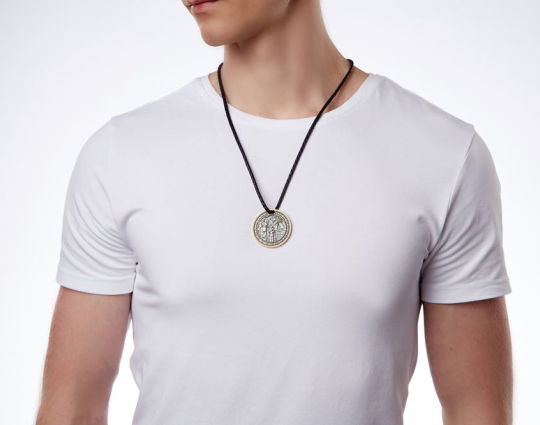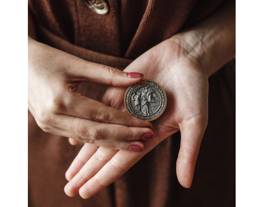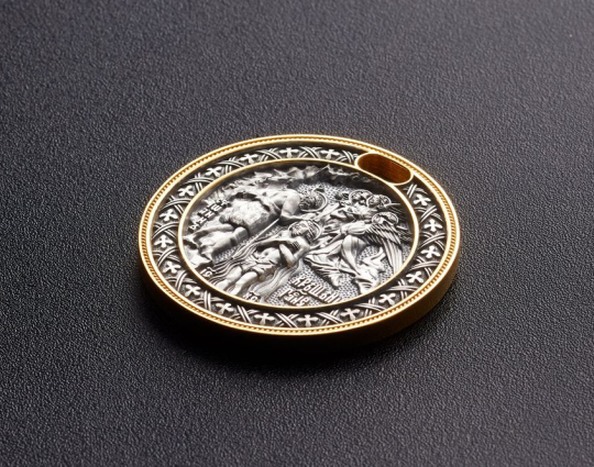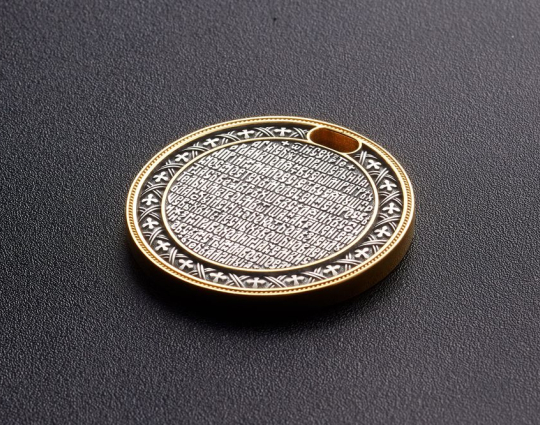 Серебряный образок с позолоченной отделкой. На лицевой стороне размещено изображение "Крещения". Его окантовывает орнаментальный узор. На нательной стороне- молитва. Ее можно читать в любых жизненных ситуациях.