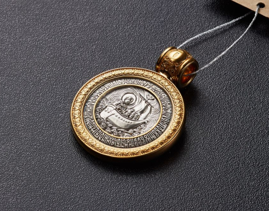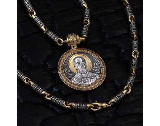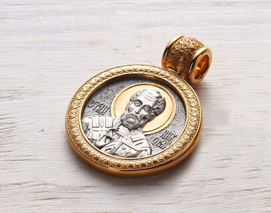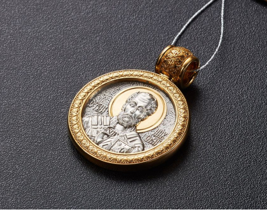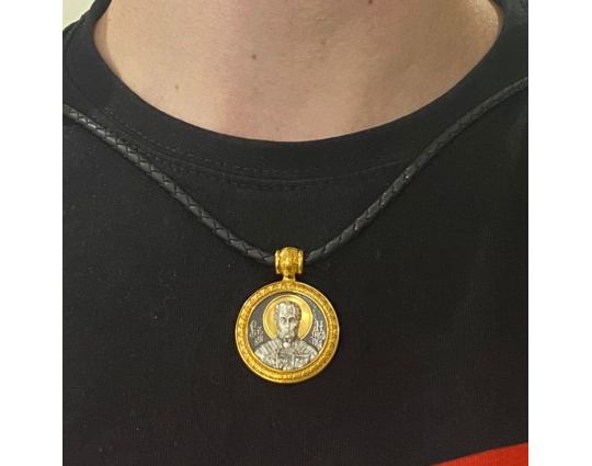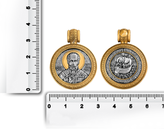 Круглый серебряный образок с позолоченными элементами и изображением Николая Чудотворца на лицевой стороне. Николай Святой почитается в православной церкви, потому что он постоянно исцелял больных, помогал нуждающимся в сложных ситуациях, спасал путешественников от природных невзгод.