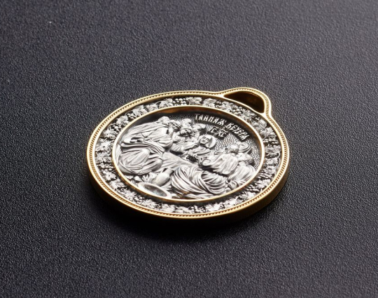 Серебряный образок с позолоченной отделкой. На лицевой стороне размещено изображение "Тайной вечери".  Его окантовывает венок из виноградных  ветвей с ягодами.  С древних времен они символизировали Иисуса Христа. Прикоснуться к нему могут православные через причастие.