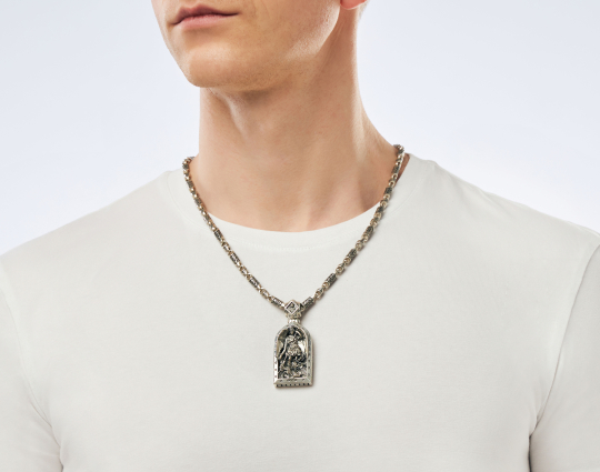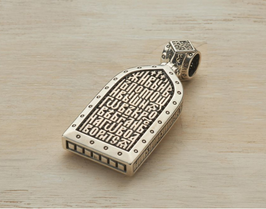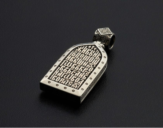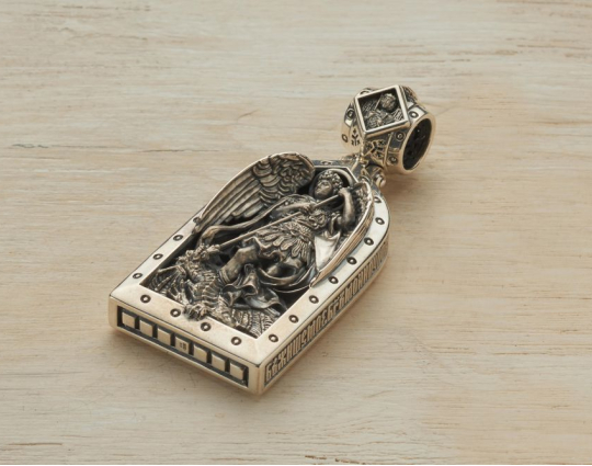 Православный образок из серебра выполнен объемным и массивным. На лицевой стороне изображен Архангел Михаил, несокрушимый защитник людей, верховный военачальник всего ангельского воинства. Его имя означает «Кто яко Бог?». Архангел считается самым могучим и грозным врагом зла, главным борцом против дьявола и беззакония.