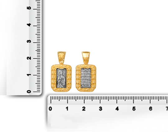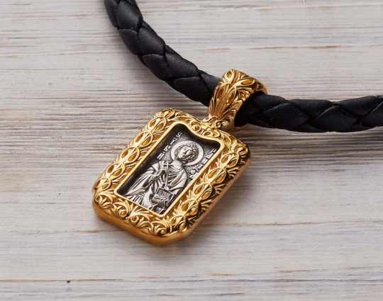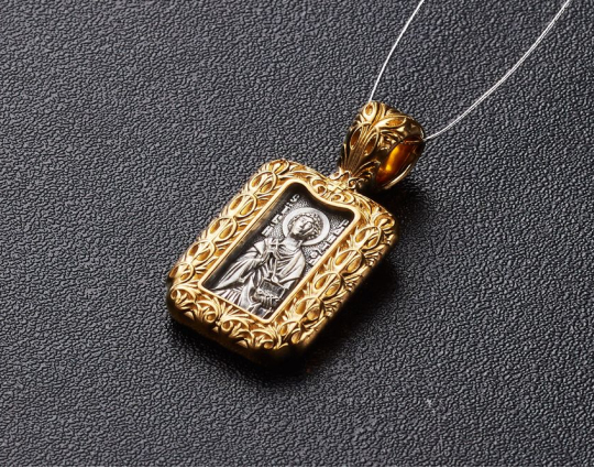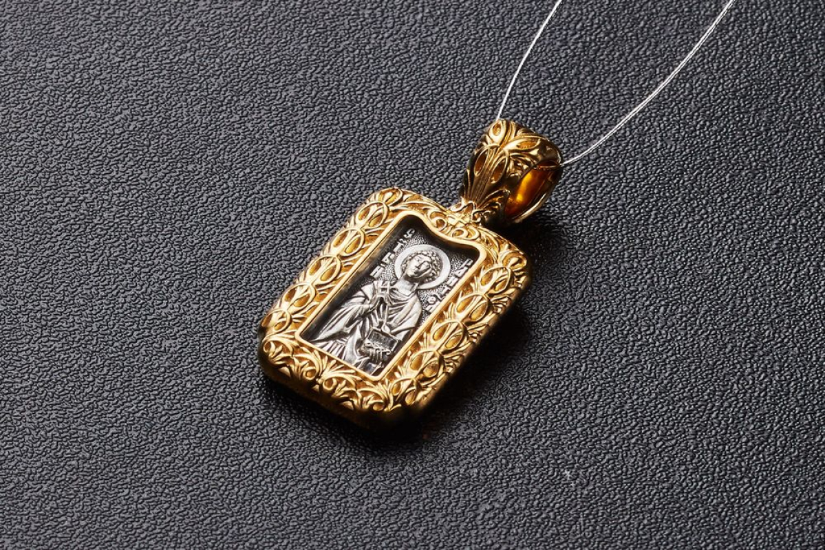 Серебряный образок, на котором изображен Пантелеимон Целитель. Его образ заключен в массивную позолоченную рамку из листьев аканта. В руках Святой держит ложку и небольшой сундук. Это атрибуты врачей из древних времен.
