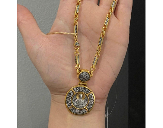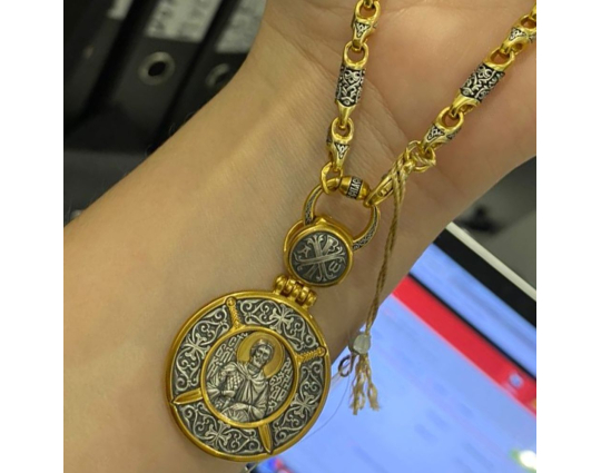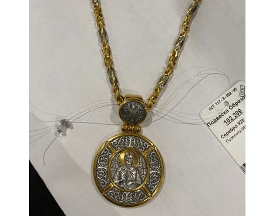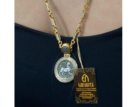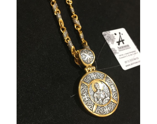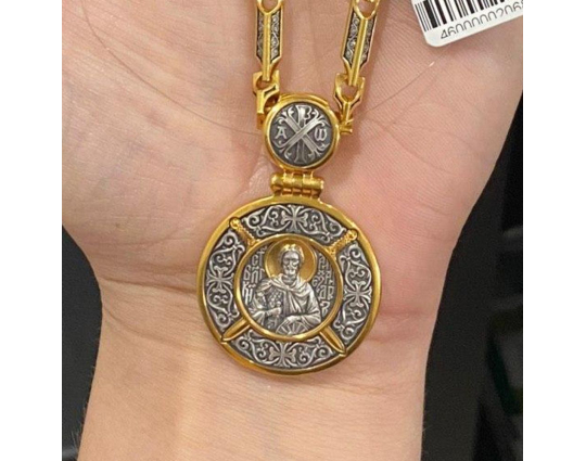 Круглый серебряный образок с изображением Александра Невского, которое помещено в круг перед двумя позолоченными скрещенными мечами. Остальная часть образка украшена орнаментом.