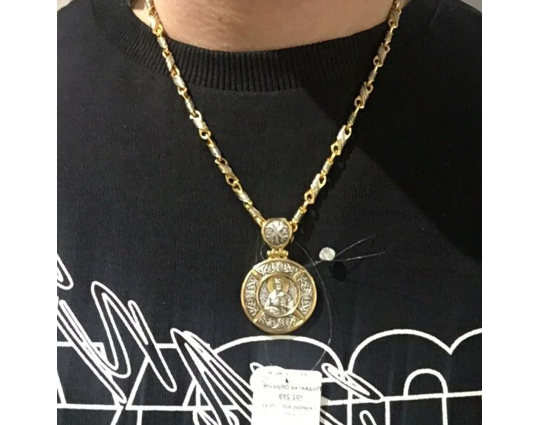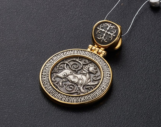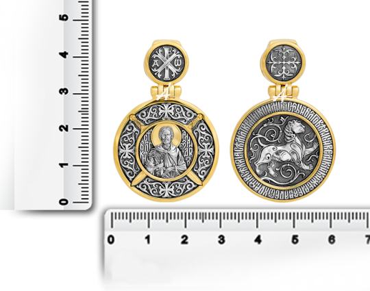 На обратной стороне изображен лев. Согласно древним преданиям, это знак силы, власти и храбрости. Вокруг льва, по контуру, написаны слова из молитвы, с которыми можно обратиться к Святому.