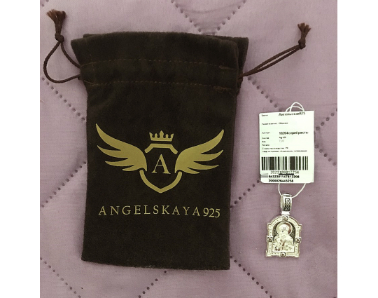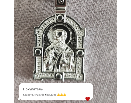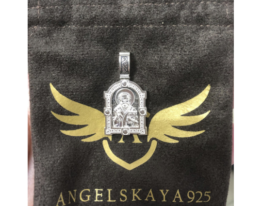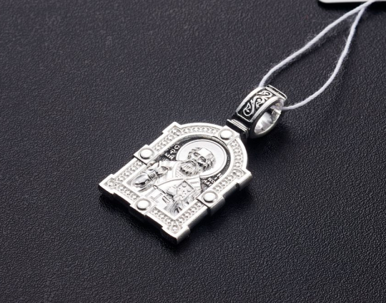 На лицевой части этого серебряного образка  изображен Николай Чудотворец. Он один из самых почитаемых святых на Руси. У него просят защиты от болезней, помощи в путешествии, учебе и в поиске достойного супруга. Контур обрамляет широкая полоса с узором, которая дополняет образок.