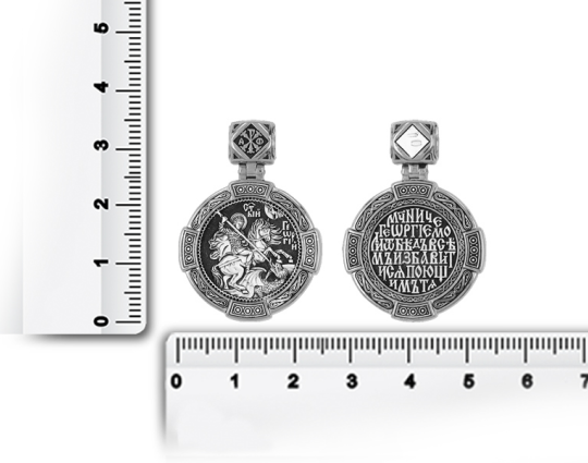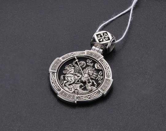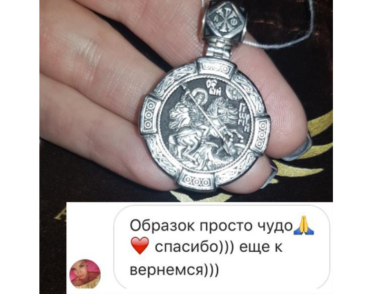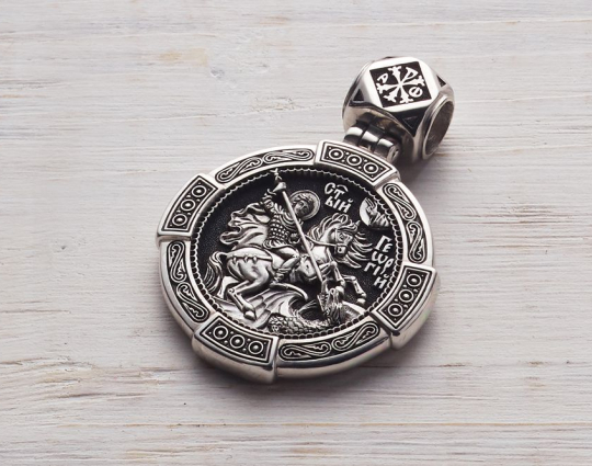 Круглый образок с изображением Святого Георгия во время свершения его знаменитого подвига: спасение принцессы от змея. Притом, считается, что принцесса символизирует душу человека, а змей - дьявола-искусителя. Победа Георгия означает то, что душа спасена от гибели.