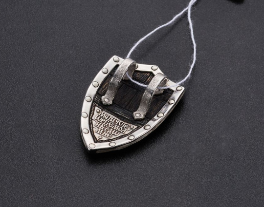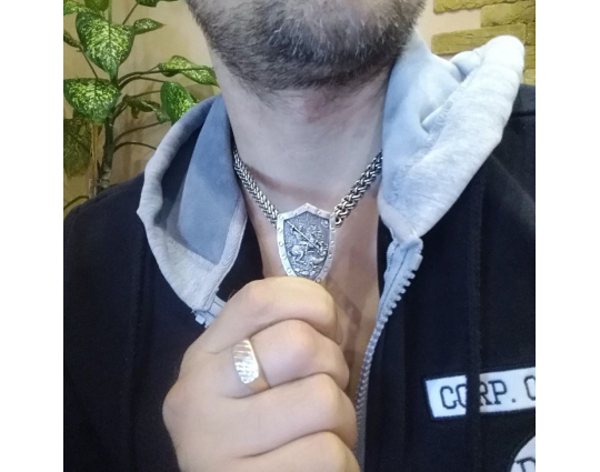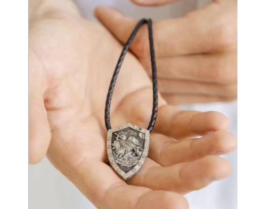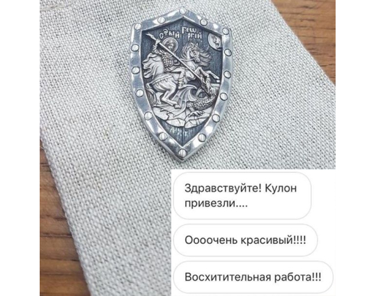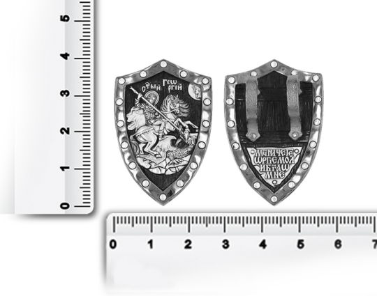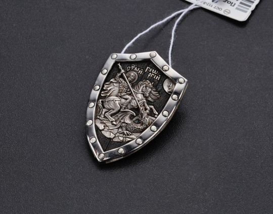 Образок в виде щита с изображением Святого Георгия во время свершения его знаменитого подвига: спасение принцессы от змея. Притом, считается, что принцесса символизирует душу человека, а змей - дьявола-искусителя. Победа Георгия означает то, что душа спасена от гибели.