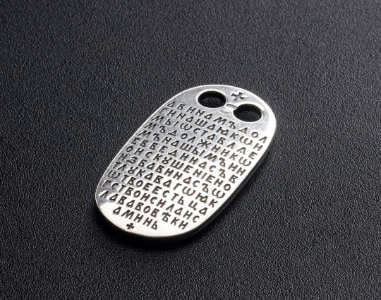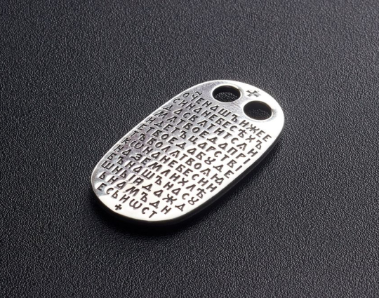Образок, состоящий из серебряной пластины. На пластине -молитва "Отче наш". Ее можно читать в любых жизненных ситуациях: в опасности,  при семейных неурядицах или проблемах с близкими и родными.