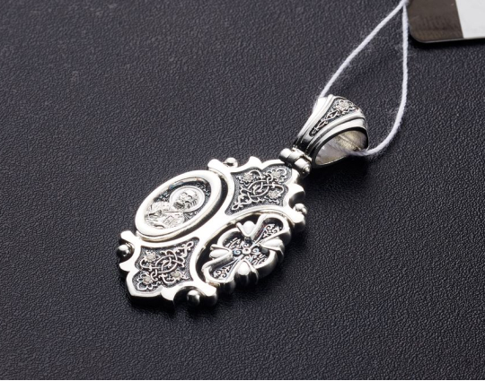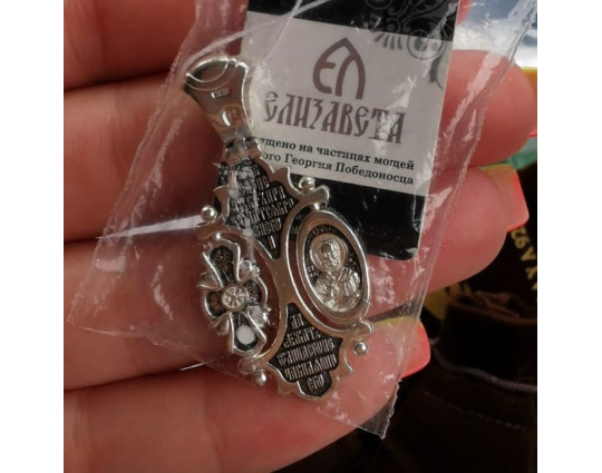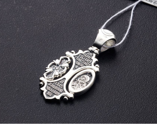 Серебряный кулон с резным православным крестом с инициалами Христа и иконой, на которой изображена Владимирская Божья Матерь. Этим украшена лицевая часть образка. На обратной стороне расположен образ Николая Чудотворца и хризма, которая нанесена на крест. Хризма -монограмма Христа и его древнейший символ.