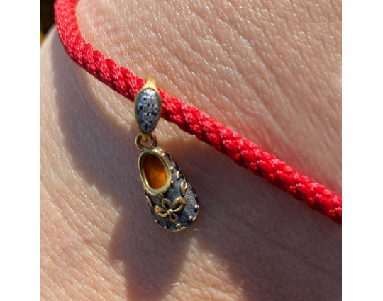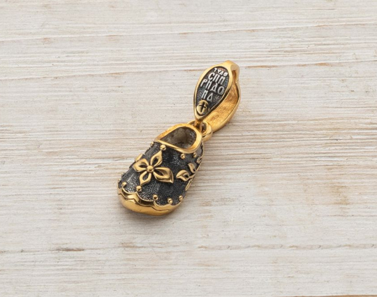 Миниатюрная подвеска выполнена в виде башмачка. Считается, что он принадлежит святому Спиридону Тримифунтскому. Этот человек никогда никому не отказывал в помощи. Его жизнь была наполнена чудотворением, бескорыстной помощью нуждающимся и верой в Иисуса Христа.