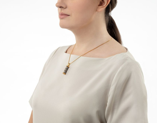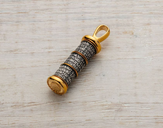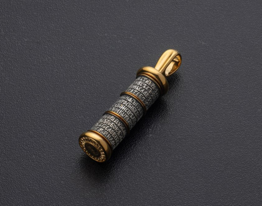 Подвеска выполнена из серебра 925 пробы с позолотой. На поверхности изделия размещены слова молитвы к Богородице, Пресвятой Троице и Предначинательной молитвы.
