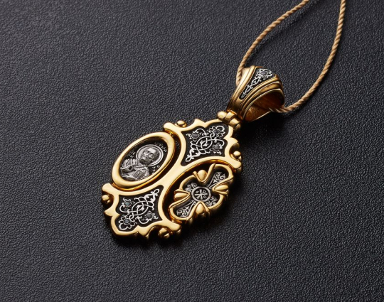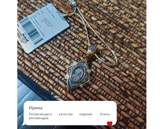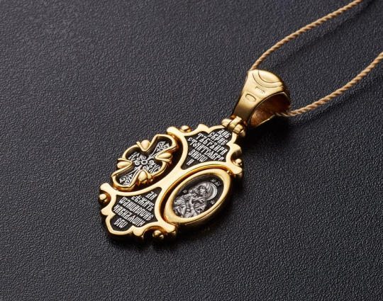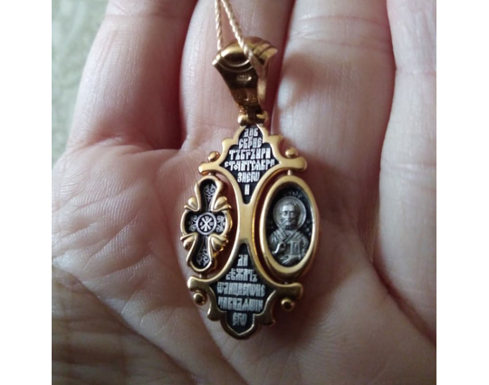 Серебряный кулон с позолотой с резным православным крестом с инициалами Христа и иконой, на которой изображен Николай Чудотворец и хризма, которая нанесена на крест. Хризма -монограмма Христа и его древнейший символ. Этим украшена лицевой часть образка.