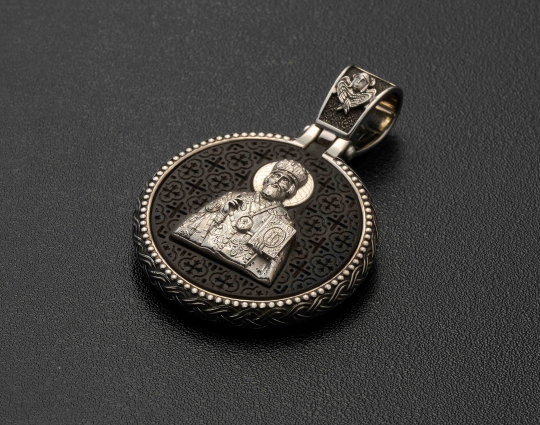 Православный образок из серебра и дерева с образом Николая Чудотворца | pe014nm | Серебро 925 пробы, эбен