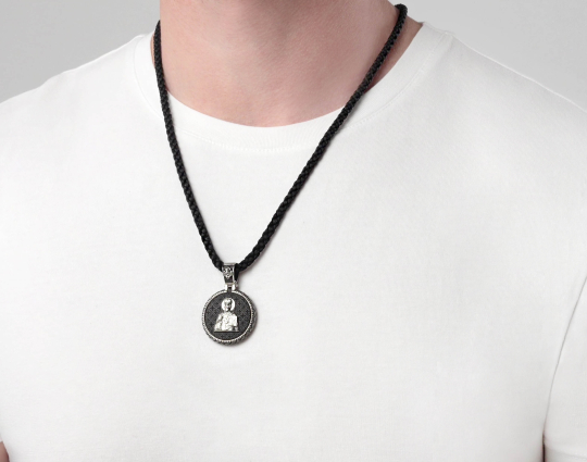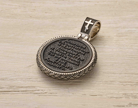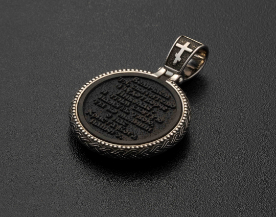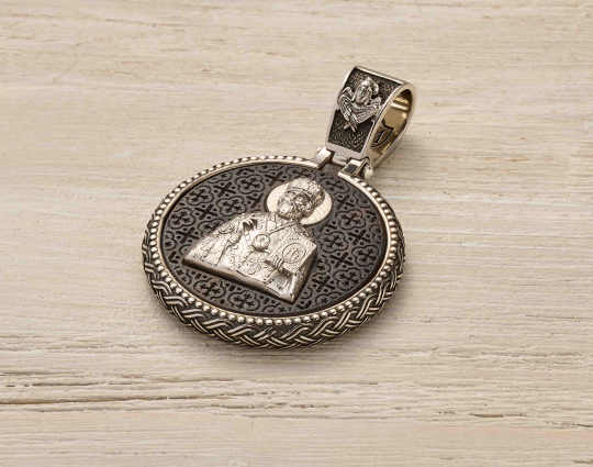 Нательный образок выполнен из серебра с основой из дерева - эбена. Такое сочетание имеет символическое значение, особую значимость. Деревянная часть воспринимается как напоминание о Животворящем Кресте. Это как источник боли и страданий для Христа, так и спасение для любого верующего.