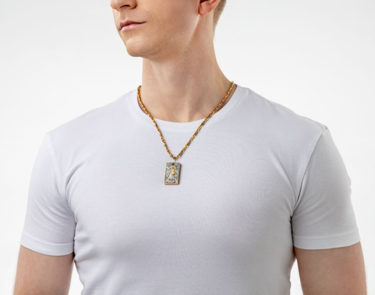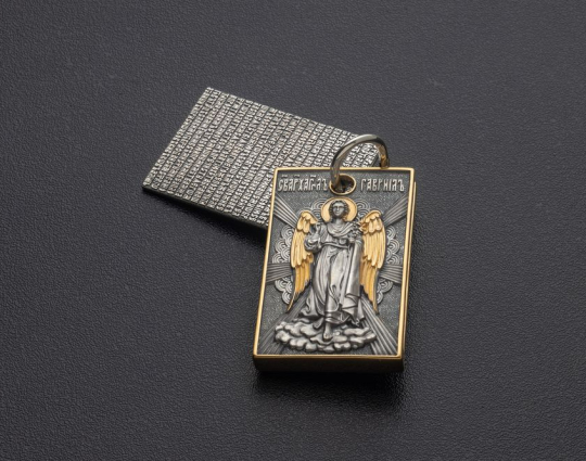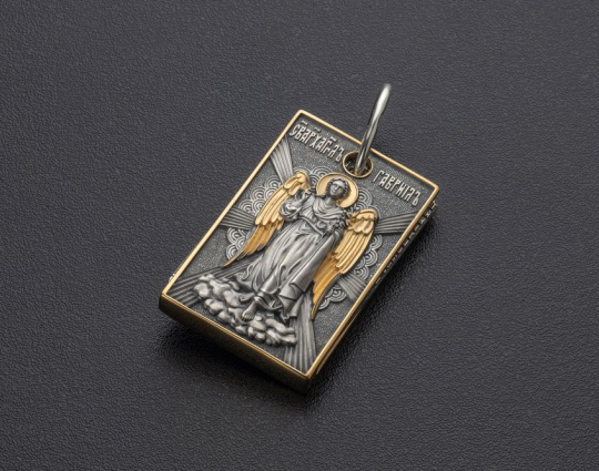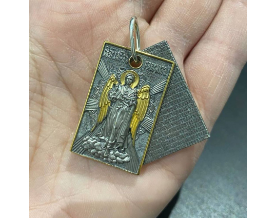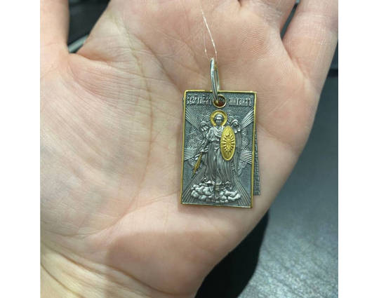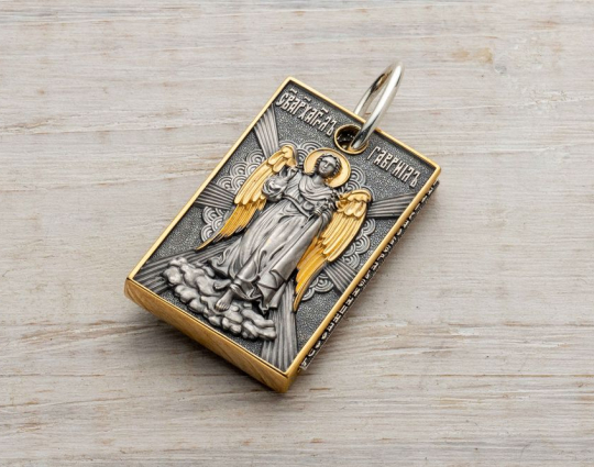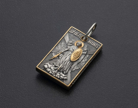 Подвеска выполнена из серебра 925 пробы. На одной части изображен Архангел Михаил - предводитель господнего войска, архистратиг. Он призван защищать людские души от всего самого злого - от искушений, соблазнов, дурных мыслей и поступков. Ему молятся о заступничестве и защите в тяжелых ситуациях.