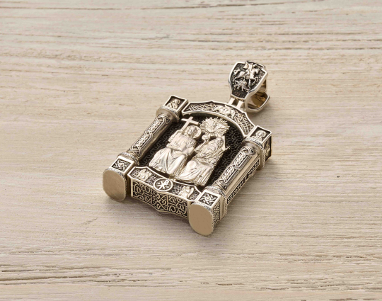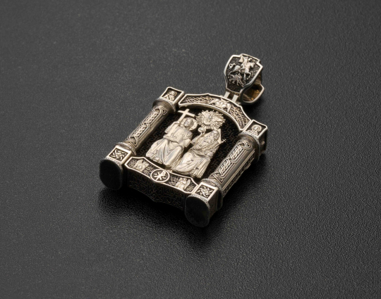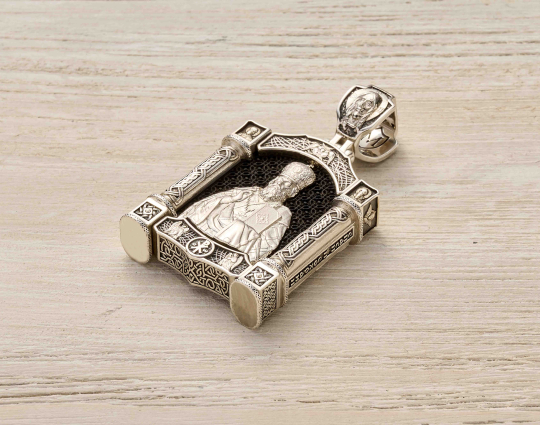 Нательный образок выполнен из серебра с основой из дерева - эбена. Такое сочетание имеет символическое значение, особую значимость. Деревянная часть воспринимается как напоминание о Животворящем Кресте. Это как источник боли и страданий для Христа, так и спасение для любого верующего.