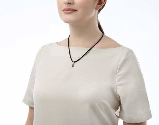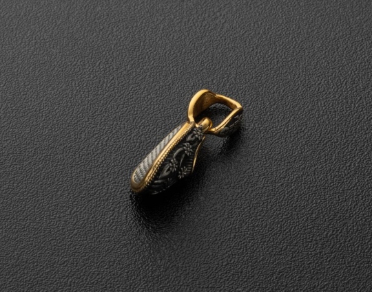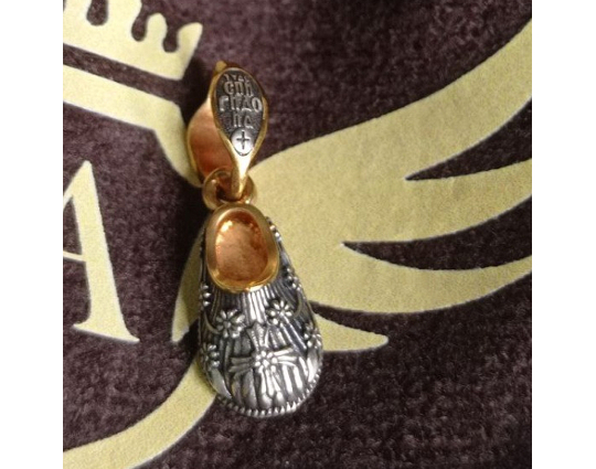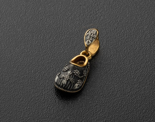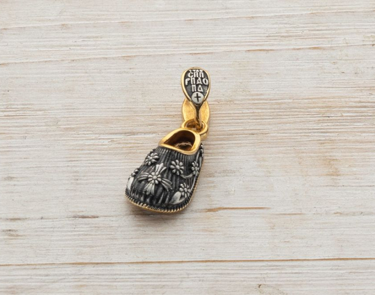 Миниатюрная подвеска выполнена в виде башмачка. Считается, что он принадлежит святому Спиридону Тримифунтскому. Этот человек никогда никому не отказывал в помощи. Его жизнь была наполнена чудотворением, бескорыстной помощью нуждающимся и верой в Иисуса Христа.