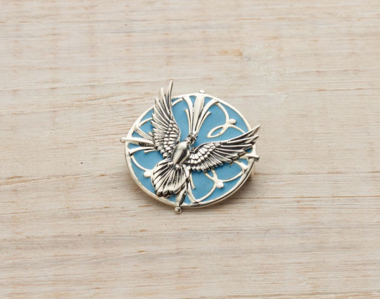 Птицы так же приносят благие вести. Брошь выполнена из серебра 925 пробы с голубой эмалью. Это образ чистого неба, свободы и гармонии. В то же время - синий цвет означает благочестие, чистоту и целомудрие.
