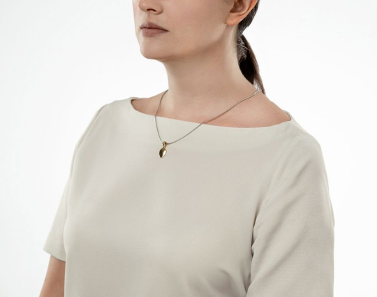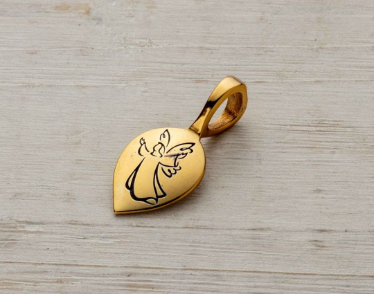 На поверхности изящной подвески  линиями изображен Ангел - Хранитель. Общая композиция с позолотой создает легкий и чистый эффект.