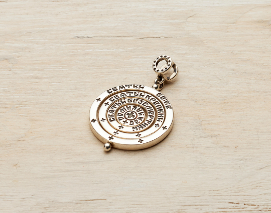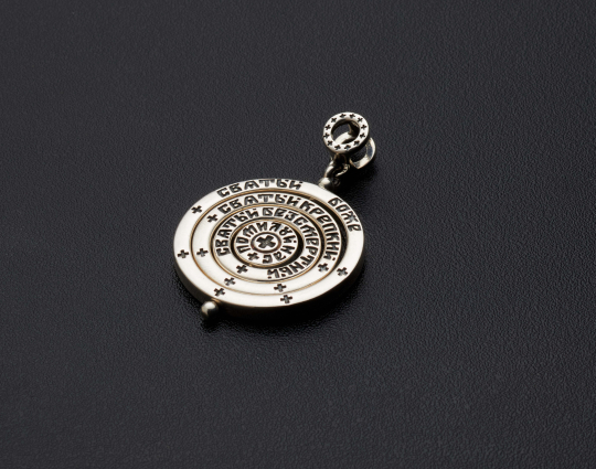 Православная подвеска из серебра выполнена в виде вращающихся колец. На каждом из них находятся слова из молитвы "Трисвятое", которую так же называют "Ангельская песнь". Обычно её читают три раза в честь трёх лиц Святой Троицы - Святый Боже, Святый Крепкий, Святый Безсмертный, помилуй нас.