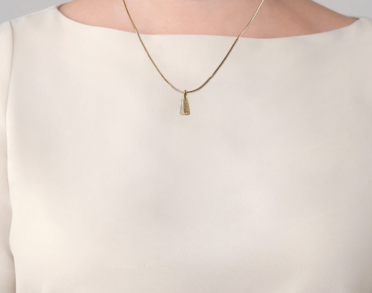 Подвеска выполнена в виде двух пластин. На одной из них нанесены слова молитвы, вторая служит щитом, закрывающим текст, подчеркивая его индивидуальную важность и сакральность.