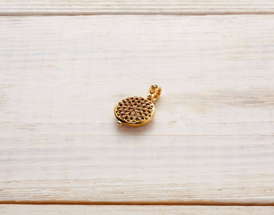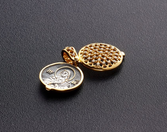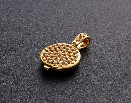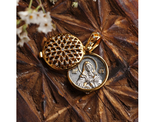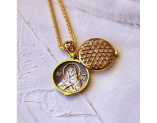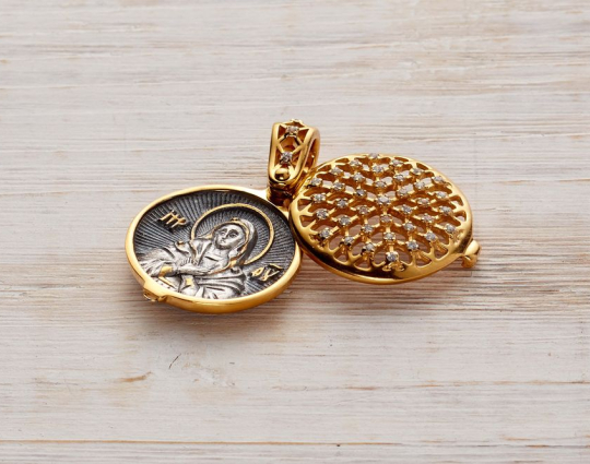 Круглая ладанка, предназначенная для женщин, потому что под верхней резной крышкой, которая украшена россыпью фианитов. расположен образ Богоматери Умиление «Радуйся, Невесто Неневестная». Эта икона пронизана особым светом и теплом. К ней обращаются, когда просят детей и помощи в родах.