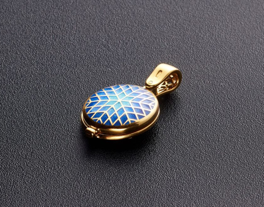 Обратная сторона ладанки украшена эмалевой росписью в нежно-голубых и синих цветах, что ассоциируется с Небом и Божьей Помощью.