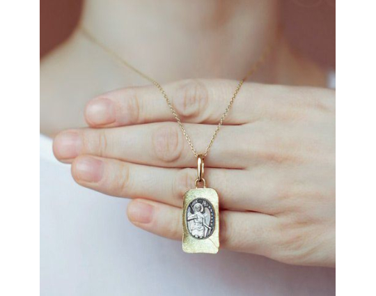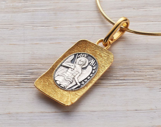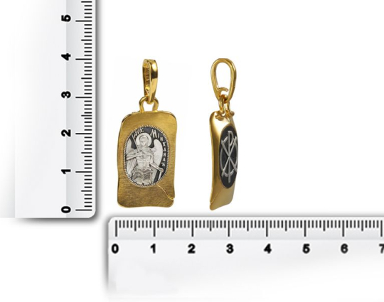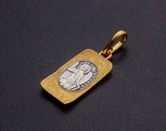 Прямоугольная подвеска из позолоченной, слегка вогнутой, фактурной пластины. На ней в центре расположен серебряный овальный медальон с изображением Архангела Михаила. Он - покровитель воинов, защитник верующих и страждущих. К нему обращаются и за исцелением, потому что считается, что он может победить злых духов, из-за которых эти болезни возникают.