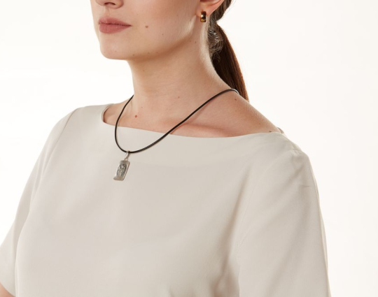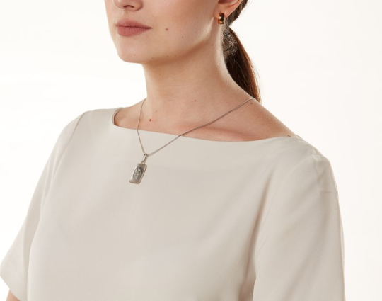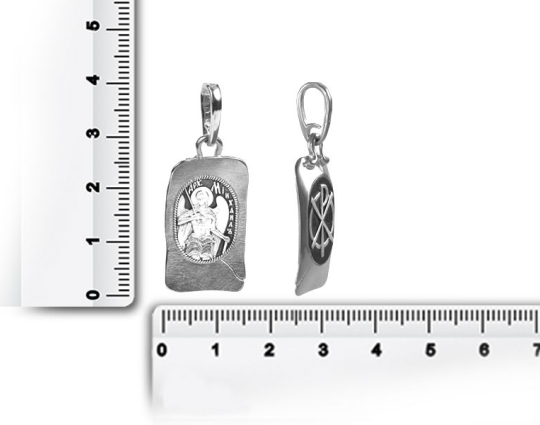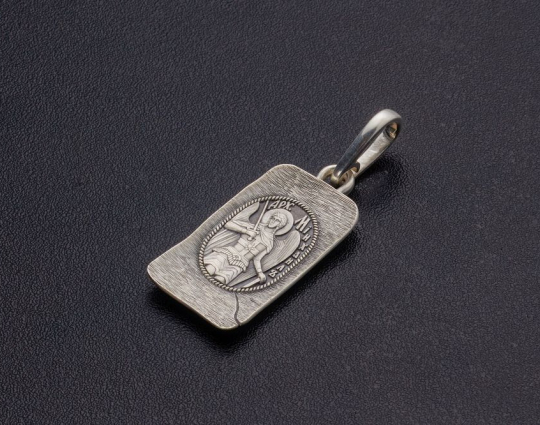 Прямоугольная подвеска из серебряной, слегка вогнутой, фактурной пластины. На ней в центре расположен овальный медальон с изображением Архангела Михаила. Он - покровитель воинов, защитник верующих и страждущих. К нему обращаются и за исцелением, потому что считается, что он может победить злых духов, из-за которых эти болезни возникают.