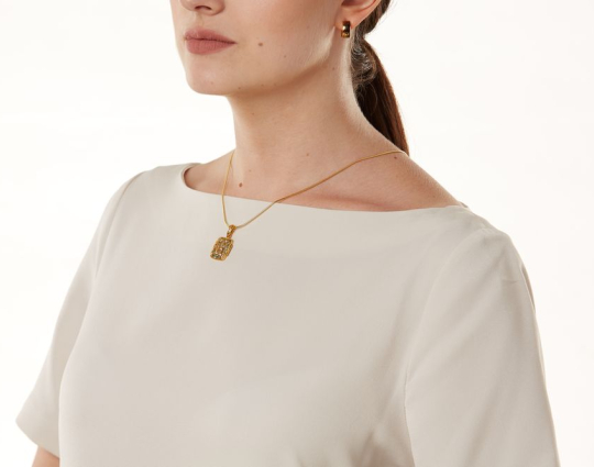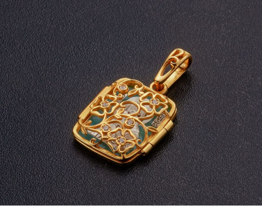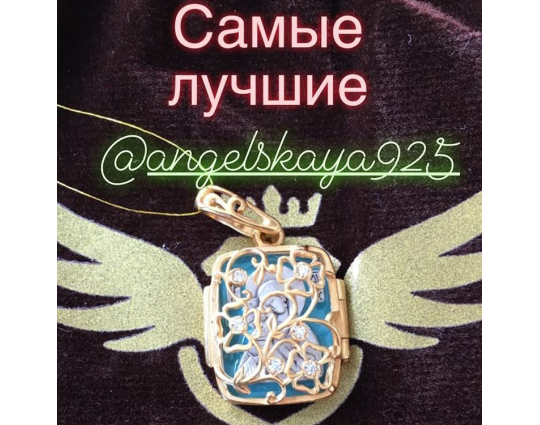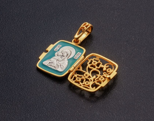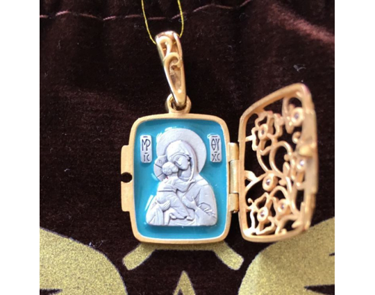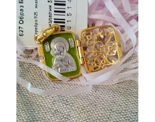 Квадратный позолоченный образок с окладом в виде лозы, украшенной фианитами (6 штук). Окладом прикрыта икона Божией Матери Владимирской, которая изображена на темно-зеленом фоне. Зеленый цвет символизирует жизнь. Кроме того, считается, что оклад символизирует таинственность Небесного мира, которая может открыться нам только в том случае, если мы будем усердно молиться.
