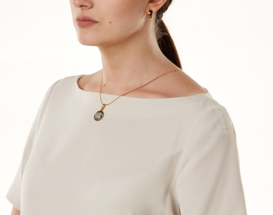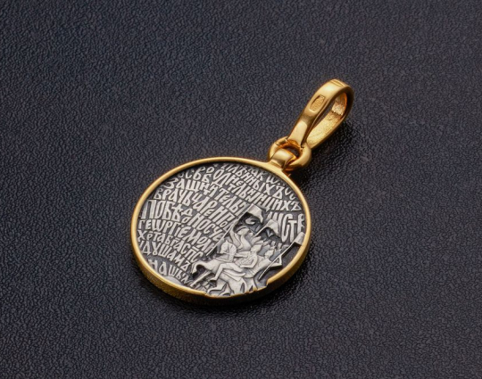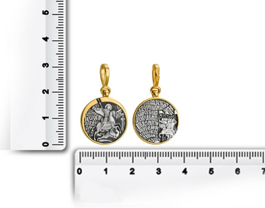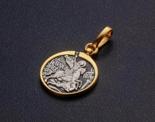Круглый серебряный образок с позолоченным контуром. На него нанесено изображение Святого Георгия во время свершения его знаменитого подвига: спасение принцессы от змея. Притом, считается, что принцесса символизирует душу человека, а змей – дьявола - искусителя. Победа Георгия означает то, что душа спасена от гибели.