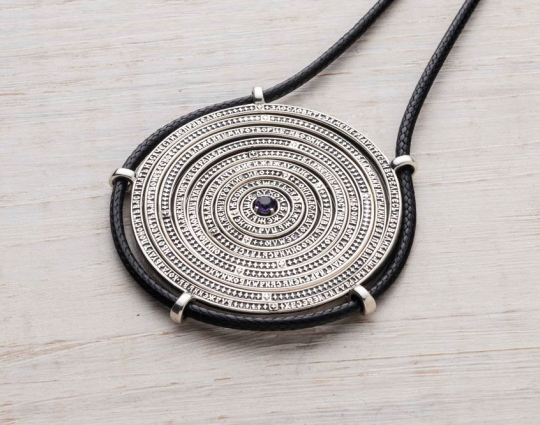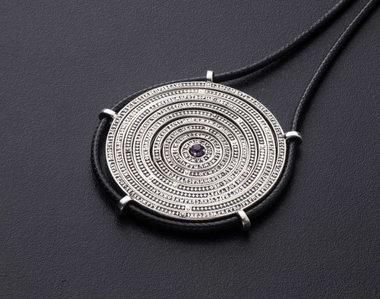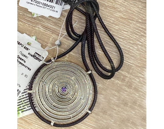 На подвеске в форме круга из серебра 925 пробы размещены 9 заповедей блаженства. По центру размещен аметист, который символизирует свет мира.