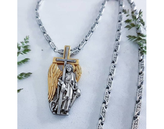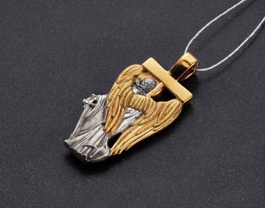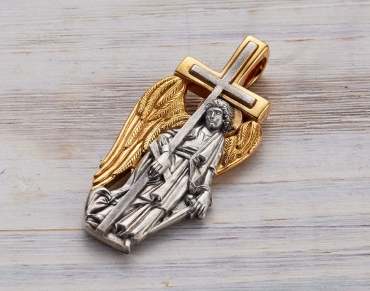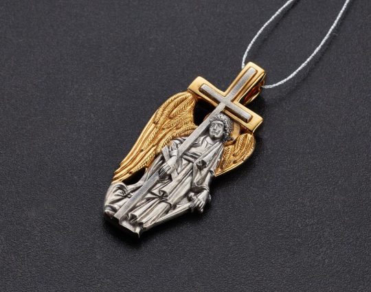 Серебряный образок с позолоченными элементами, состоящий из фигуры Ангела - Хранителя, проработанной до самых мелких деталей. В руках Ангел держит крест и меч, они символизируют его поклонение Богу и желание защищать людей от злых духов.