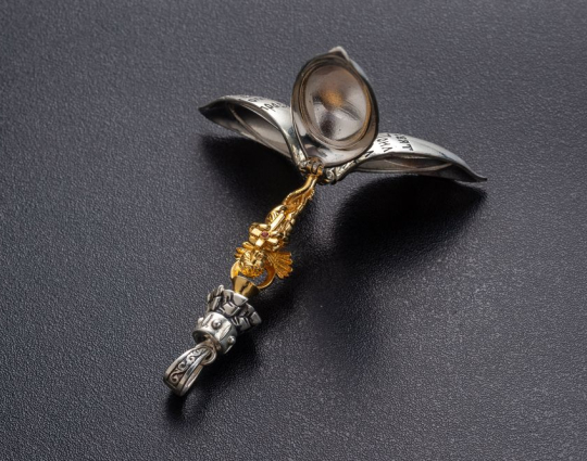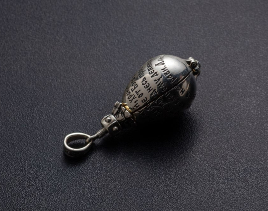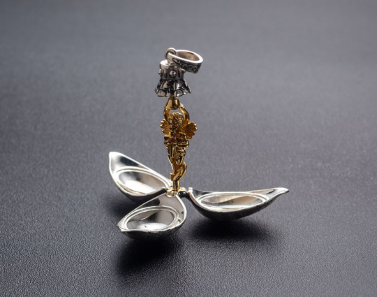 Серебряный женский медальон каплевидной формы. На корпус медальона нанесена молитва Ангелу Хранителю. Когда медальон раскрывается, он словно превращается в цветок, в середине которого находится небольшая позолоченная фигурка Ангела. Он наш самый главный помощник во всех делах.  Ангел появляется рядом с нами в момент Крещения и сопровождает нас до последнего дня. Сам по себе защитник не может вмешиваться в наши дела. Это происходит только по нашей воле, поэтому своего Ангела Хранителя нужно ежедневно упоминать в утренней или вечерней молитве.