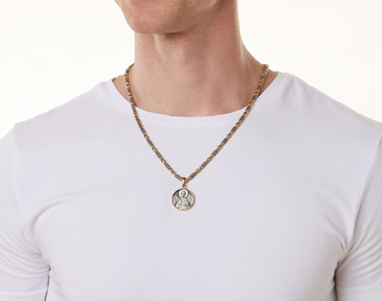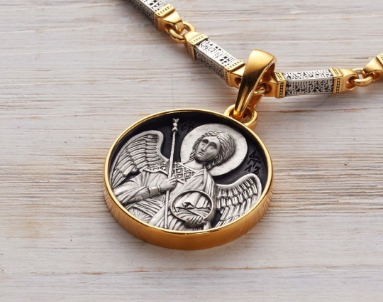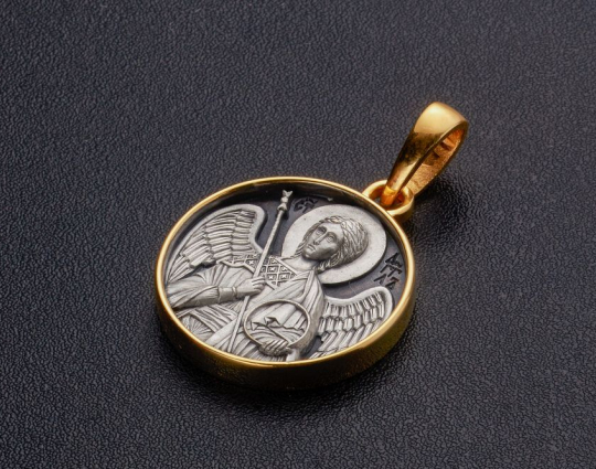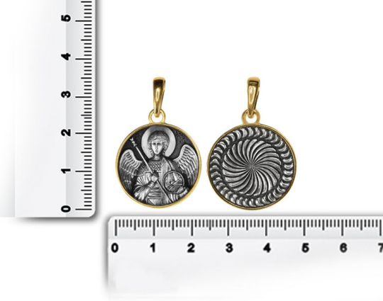 Круглый серебряный образок с позолоченной окантовкой и петелькой. На образке - Образ Ангела. Он изображен одновременно и сильным, и милостивым. А предметы в руках: посох и зерцало символы того, что Ангел - посланник Божий, который призван защищать человека и душу его от грехов тяжких.