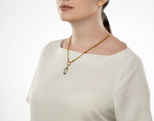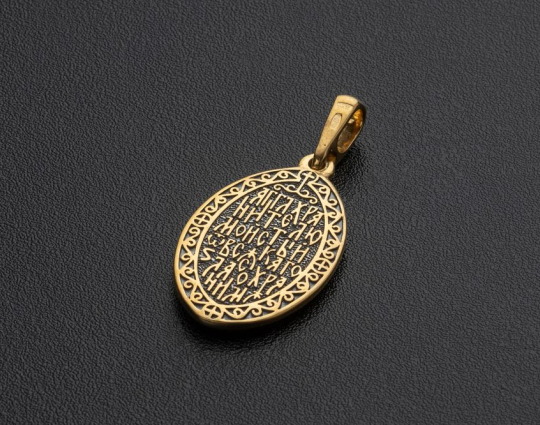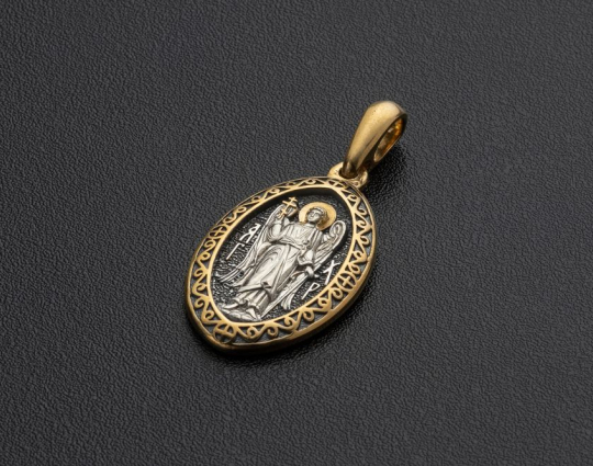 На внешней стороне подвески размещен образ Ангела - Хранителя. На обратной стороне - короткая молитва, обращенная к нему. По краю образка изящный растительный орнамент.